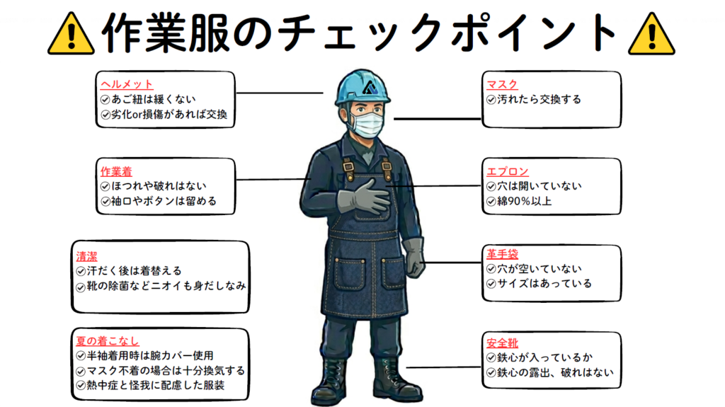 本日の朝のミーティングでは「作業着の着こなし」についてアナウンスをしました。